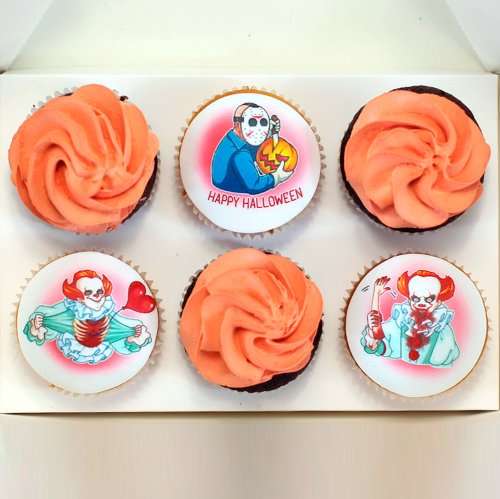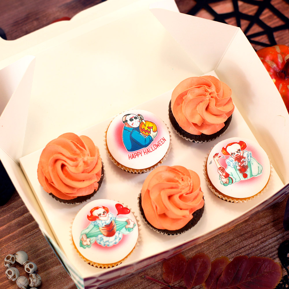 6 вкуснейших капкейков из коллекции, посвященной Хэллоуину. (3 с декором из мастики и надписями на ванильнгой основе, и 3 с кремом на шоколадной основе)