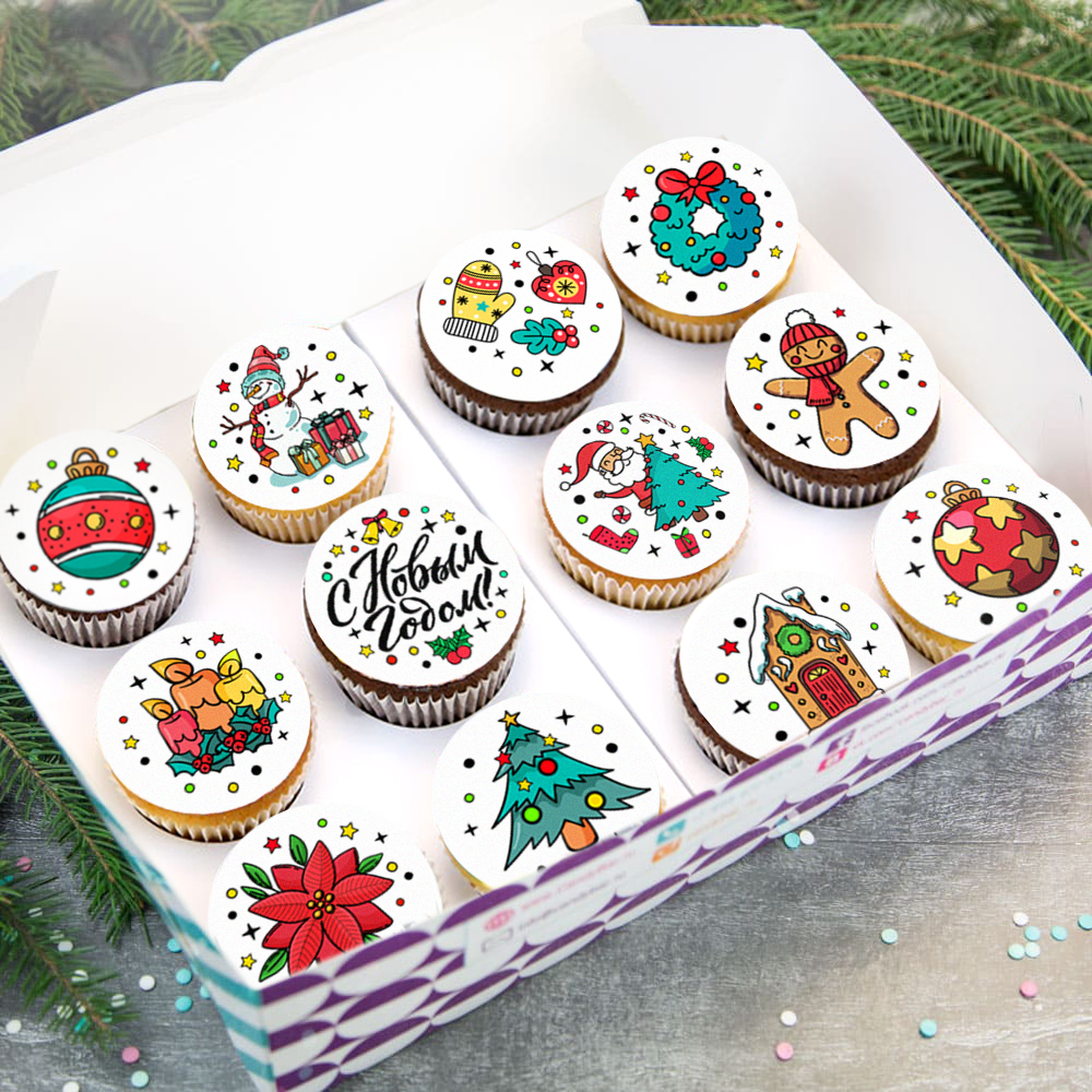 Яркий набор капкейков на Новый год - 12 пирожных в подарочной коробке, ностальгические ретро-картинки и нежная начинка внутри. Порадуйте близких вкусным подарком!