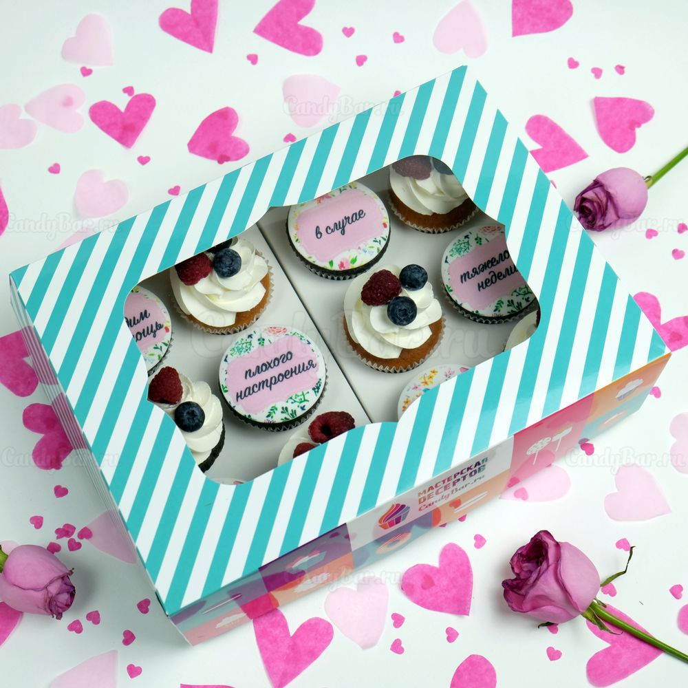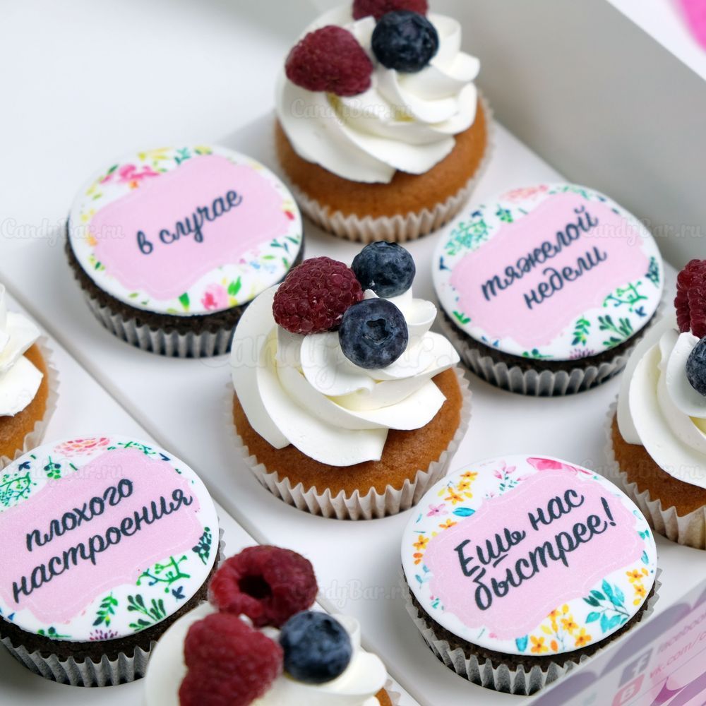Все описаниеНабор из 12 штук. 6 штук с декором из мастики и надписями (шоколадная основа), 6 штук с кремом и ягодами (ванильная основа)