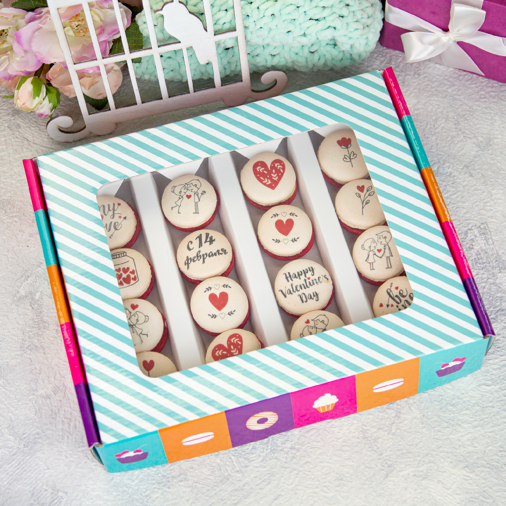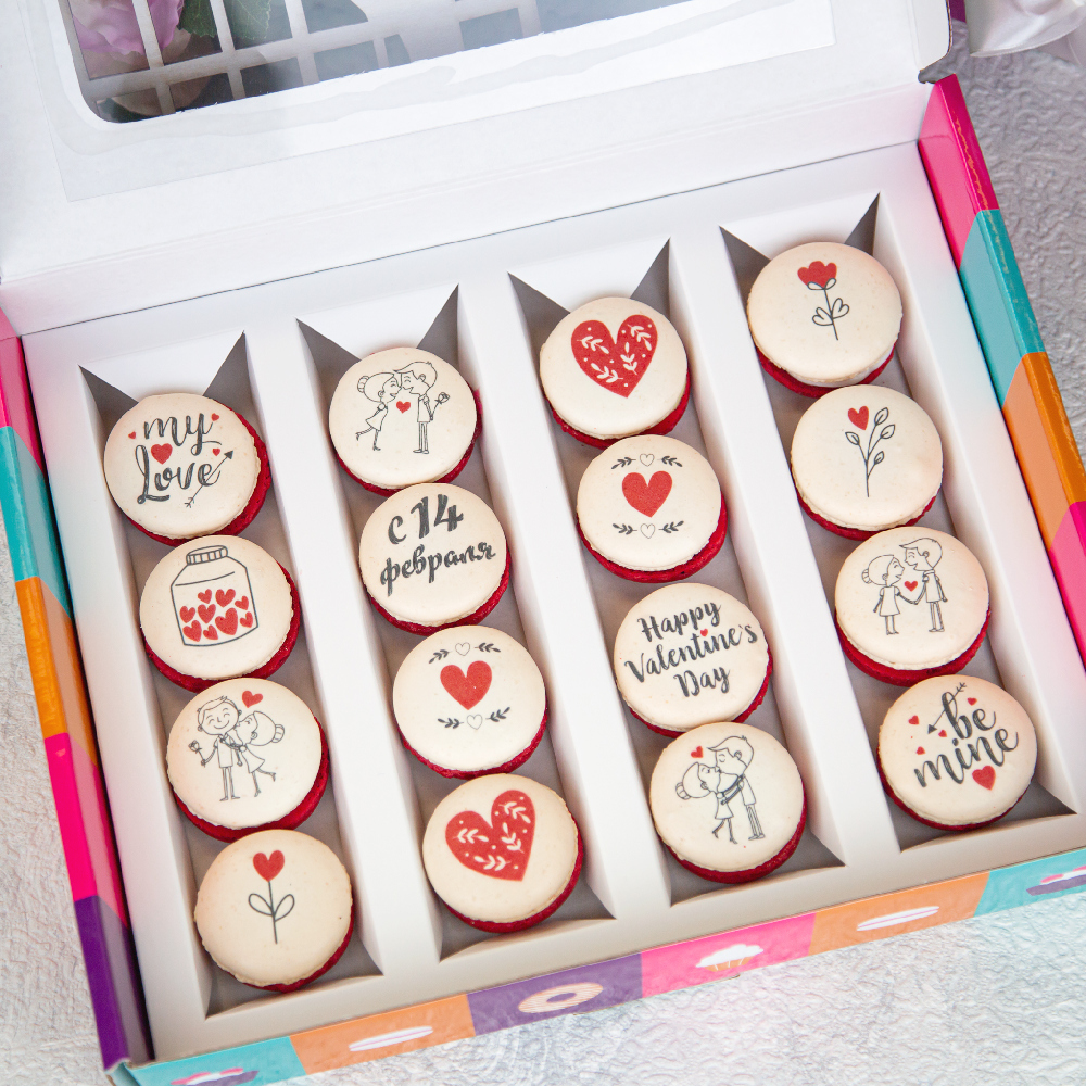 Все описаниеНабор пирожных макарони с надписью "С 14 февраля". На пирожные нанесено съедобное изображение. Состав: 16 макаронс ассорти