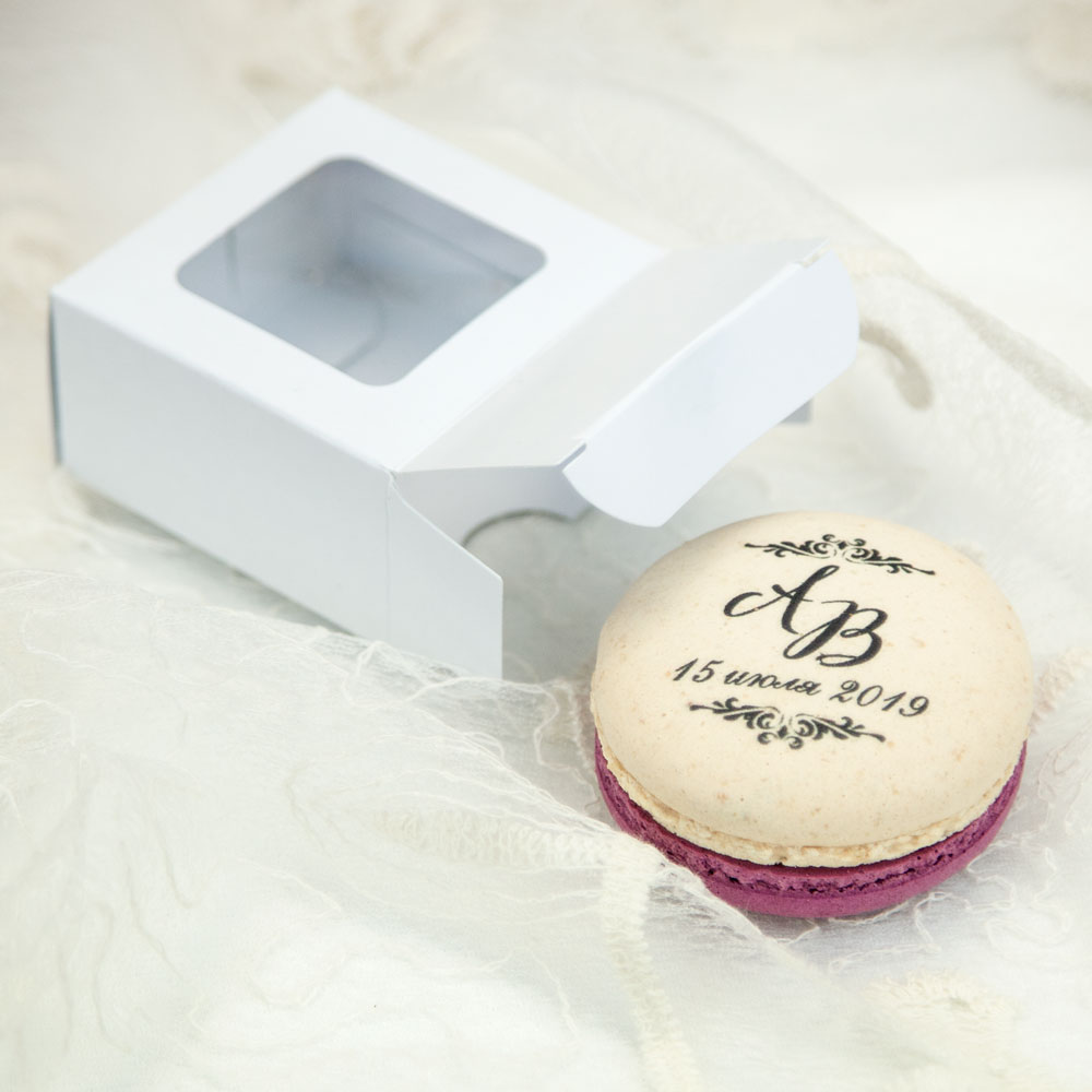 Макарун с надписью в белой коробочке с прозрачным окном.