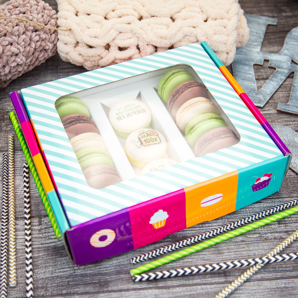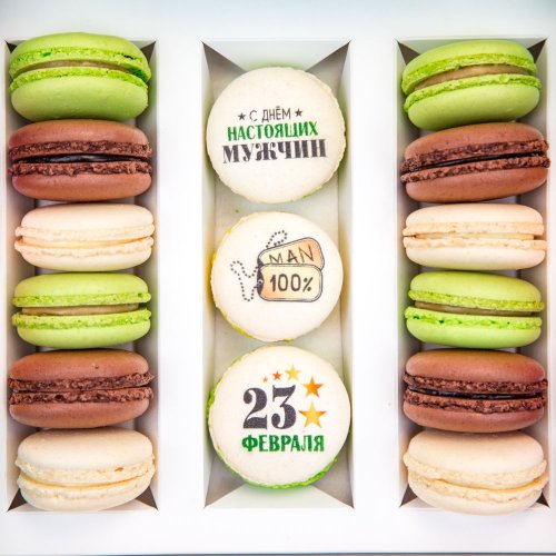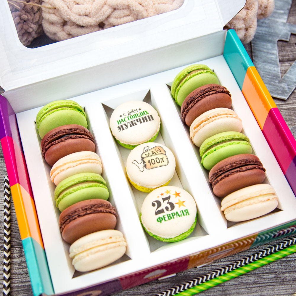 Набор макаруни из 15 штук к Дню Защитника Отечества - приятные любому мужчине поздравления, яркие цвета и аппетитные начинки. В цветной подарочной коробке 3 ванильных макаруни с принтом, 4 карамельных, 4 шоколадных и 4 ванильных макаруни. Размер коробки - 24 х 21 х 6 см.