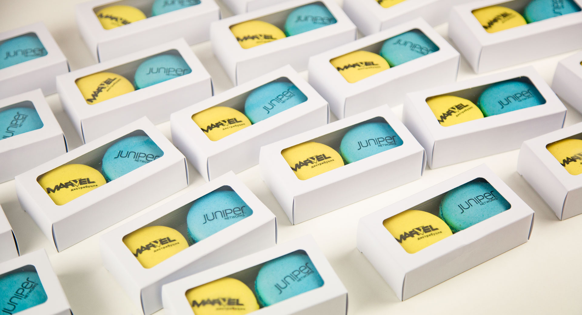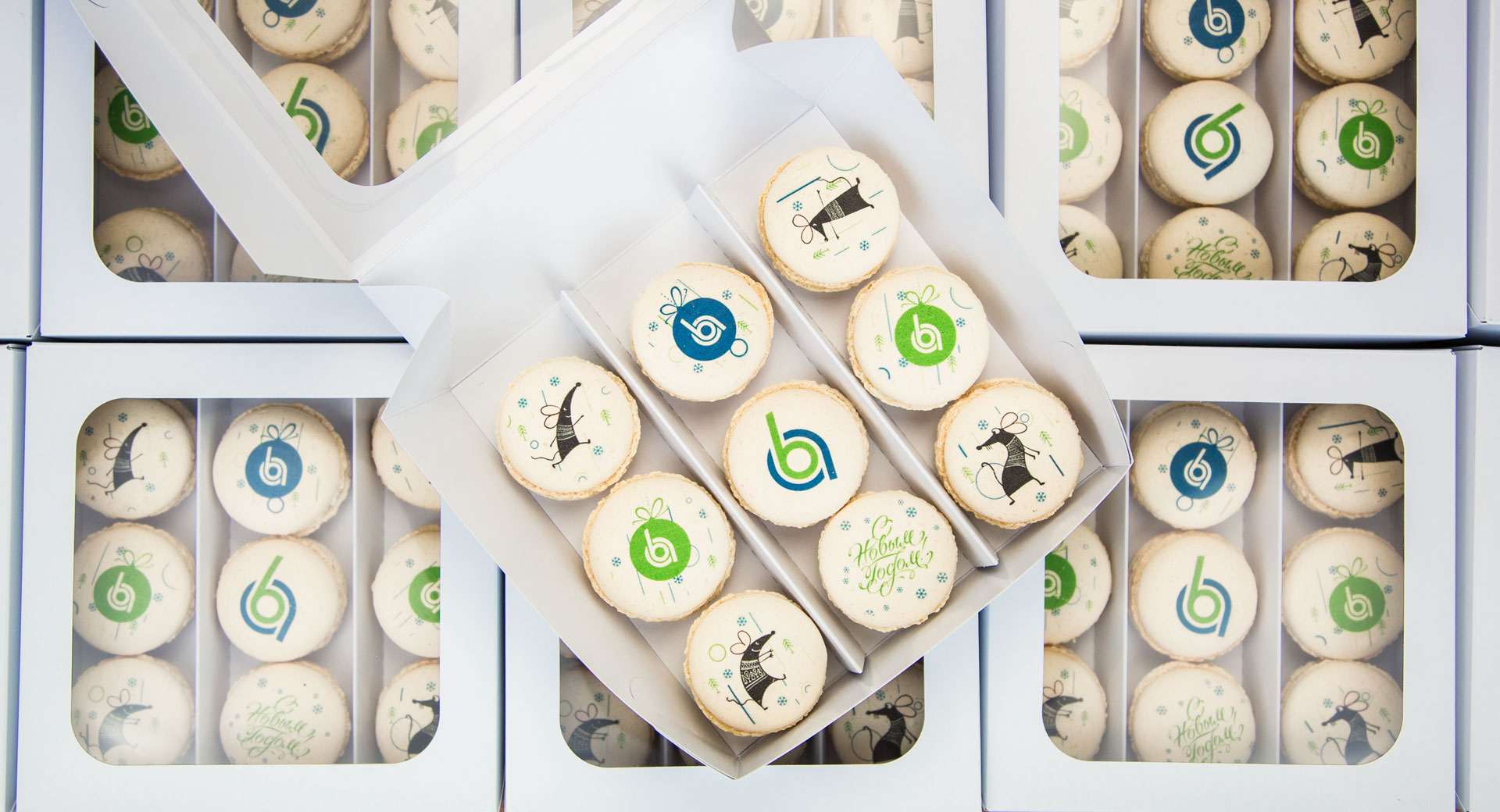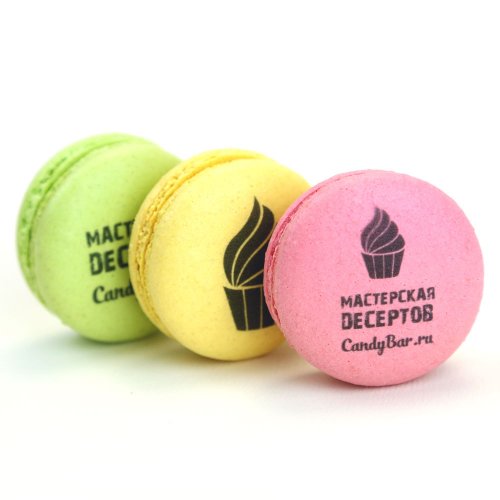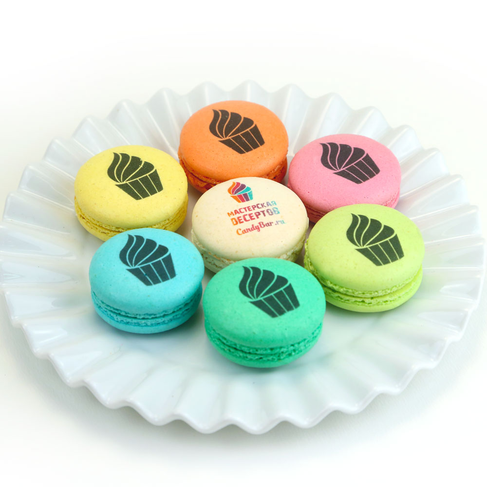 Фотопечать логотипа на пирожных-макаронс любого цвета вы можете заказать в нашей Мастерской десертов.