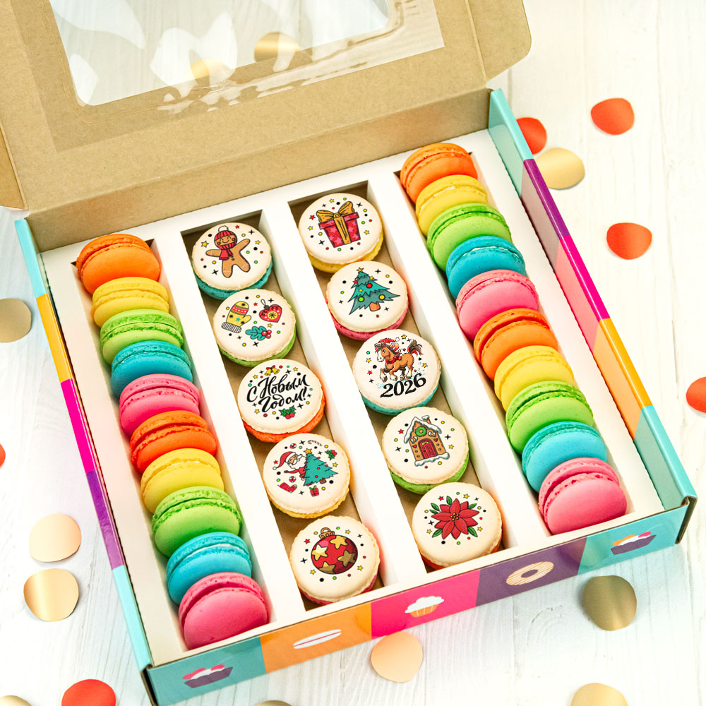 Подарочный набор макарунов к Новому году - символичные съедобные принты и вкусные начинки ассорти. Доставка по Москве - наша удобная опция.