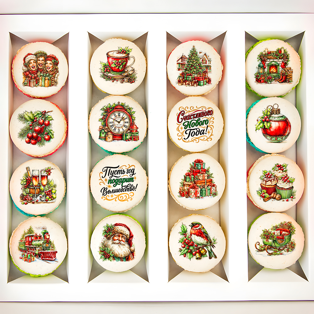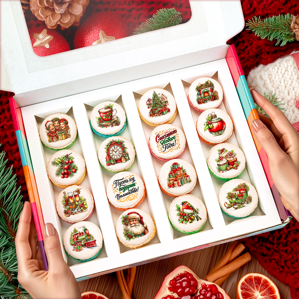 Вкусный подарочный набор на Новый год можно купить в нашей кондитерской - коробочка из 16 макарунов с новогодними картинками продемонстрирует вашу заботу и любовь.