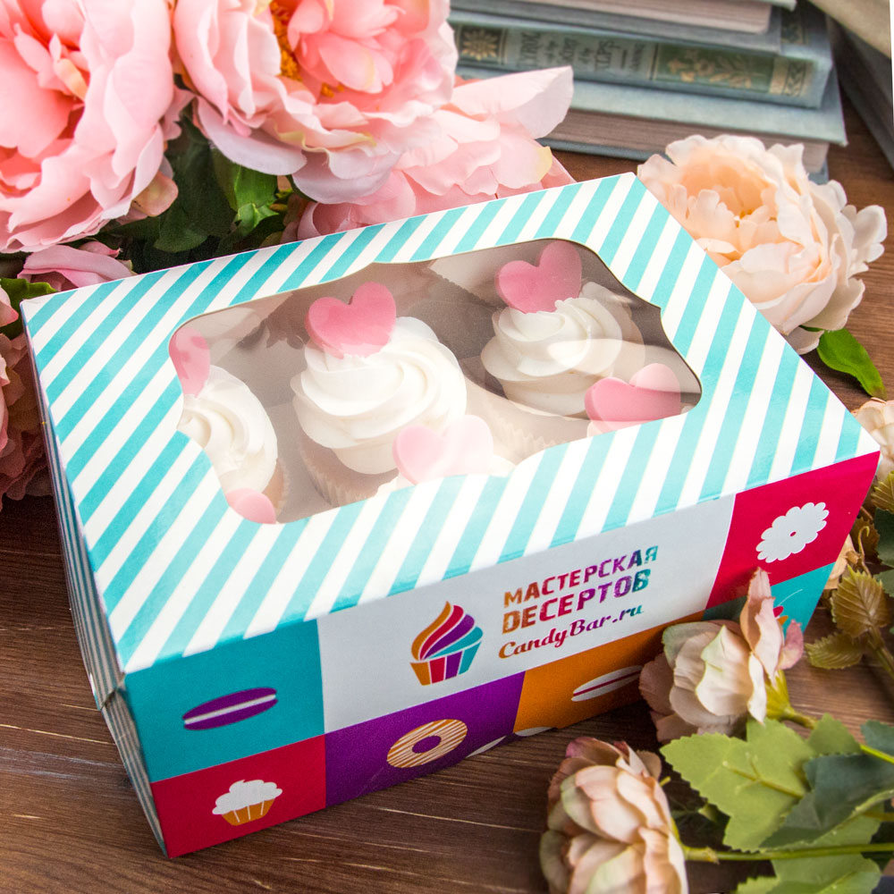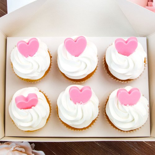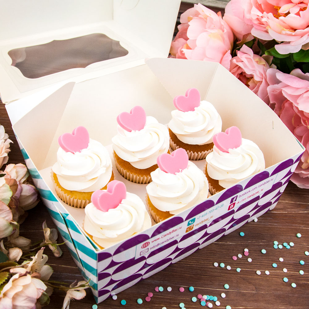 3 ванильных и 3 шоколадных капкейка с шапочками из сливочно-сырного крема. Украшены шоколадными сердечками розового цвета.
