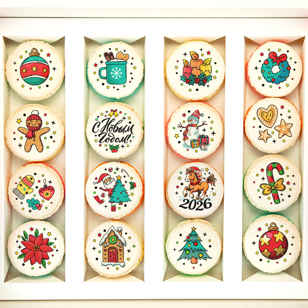 Вкусный и красивый новогодний подарок - аппетитный набор из 16 нежных макаронс со съедобной фотопечатью. Закажите сейчас, и мы доставим свежие макаруны для вас и ваших близких уже завтра!