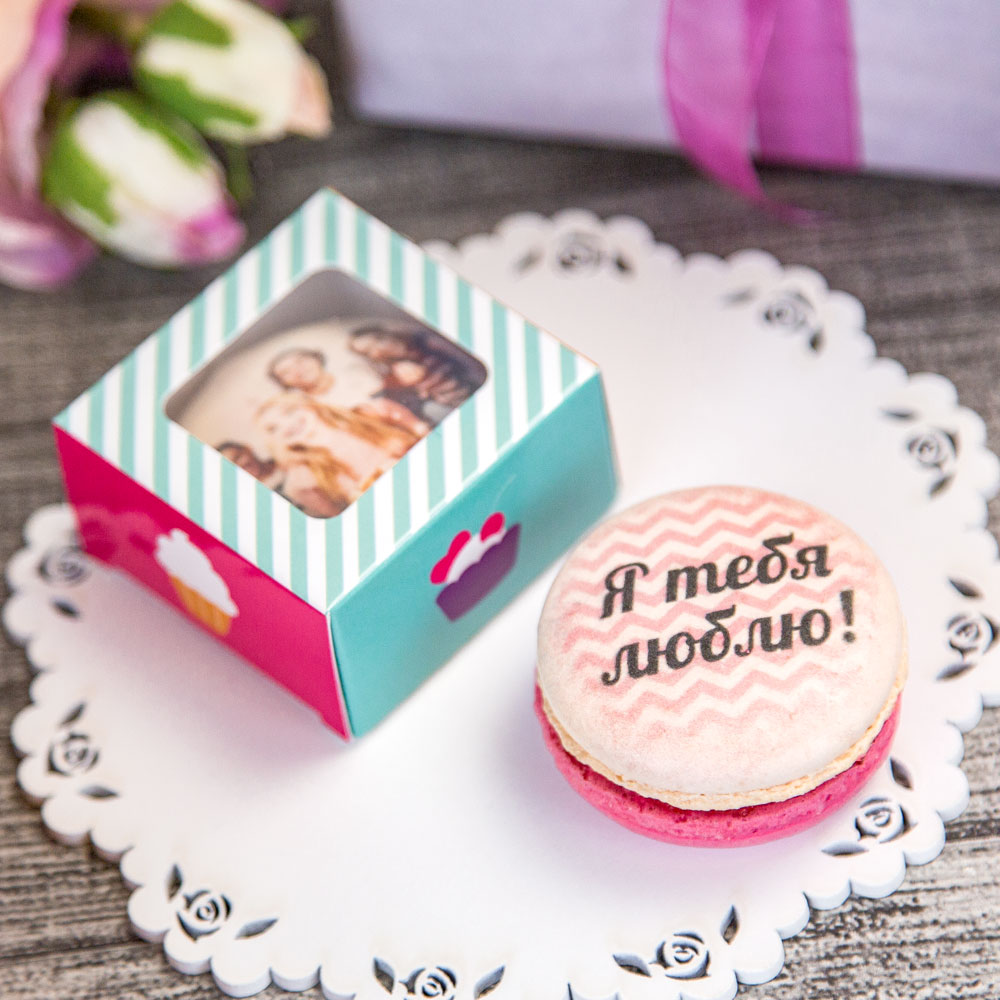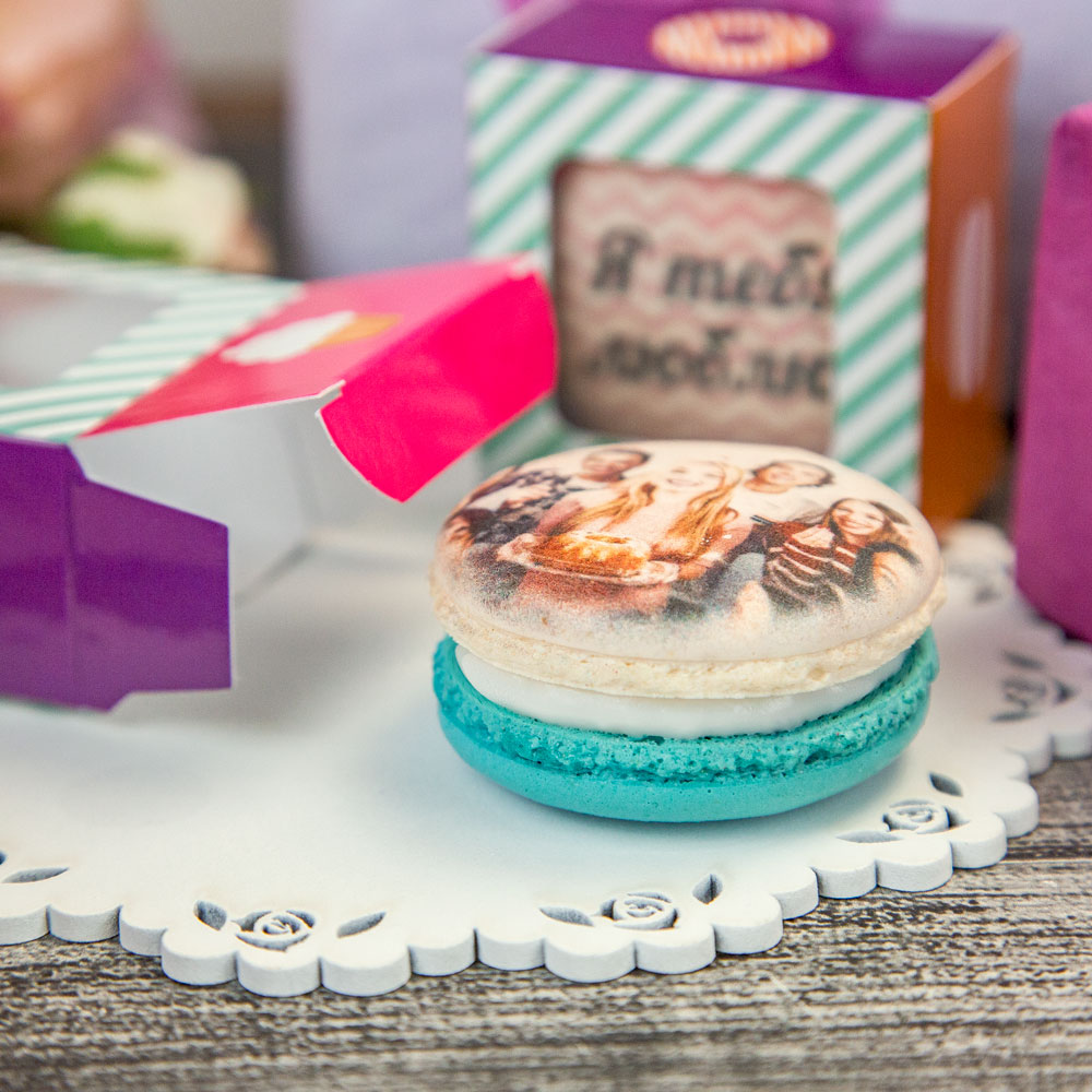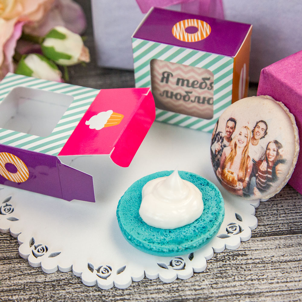 Набор из пирожного макаруни с фото и индивидуальной коробочки.