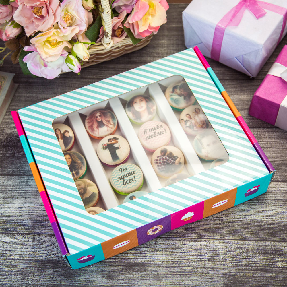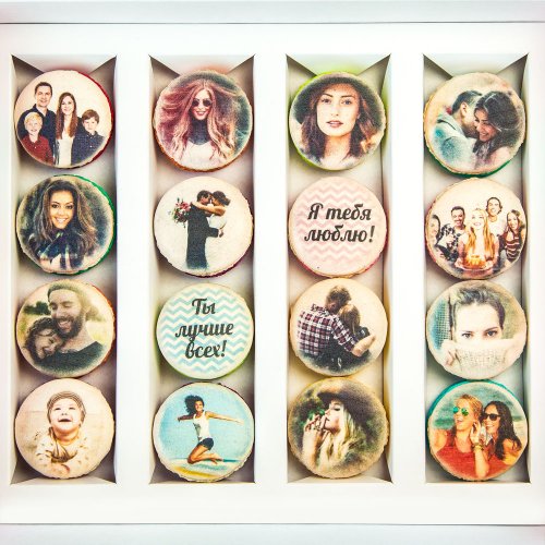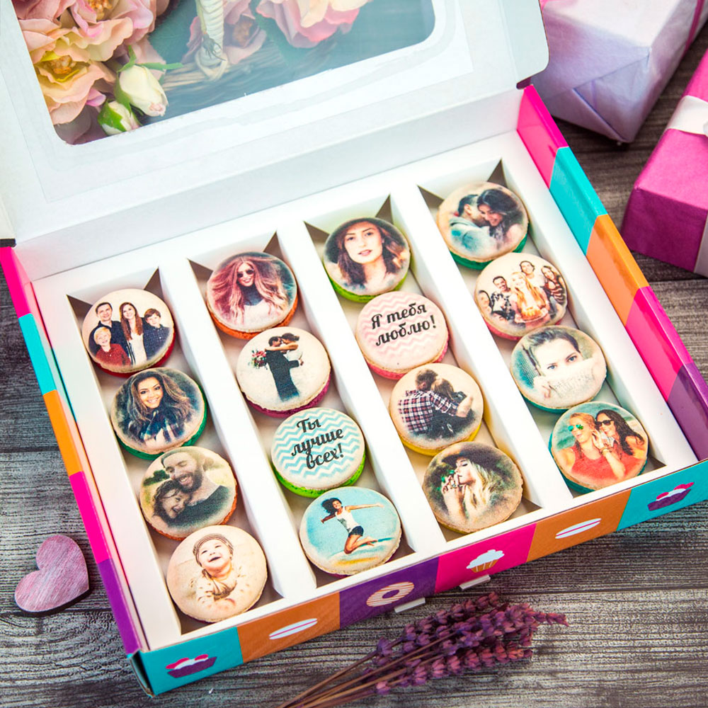 Сладкий подарок из 16 пирожных макаруни с фотографией. Цвет нижних половинок и вкус начинок - ассорти.