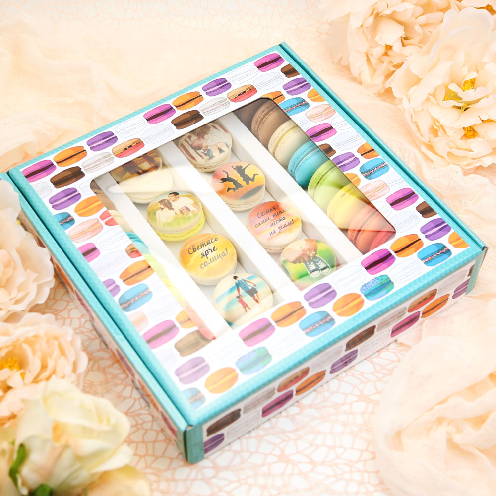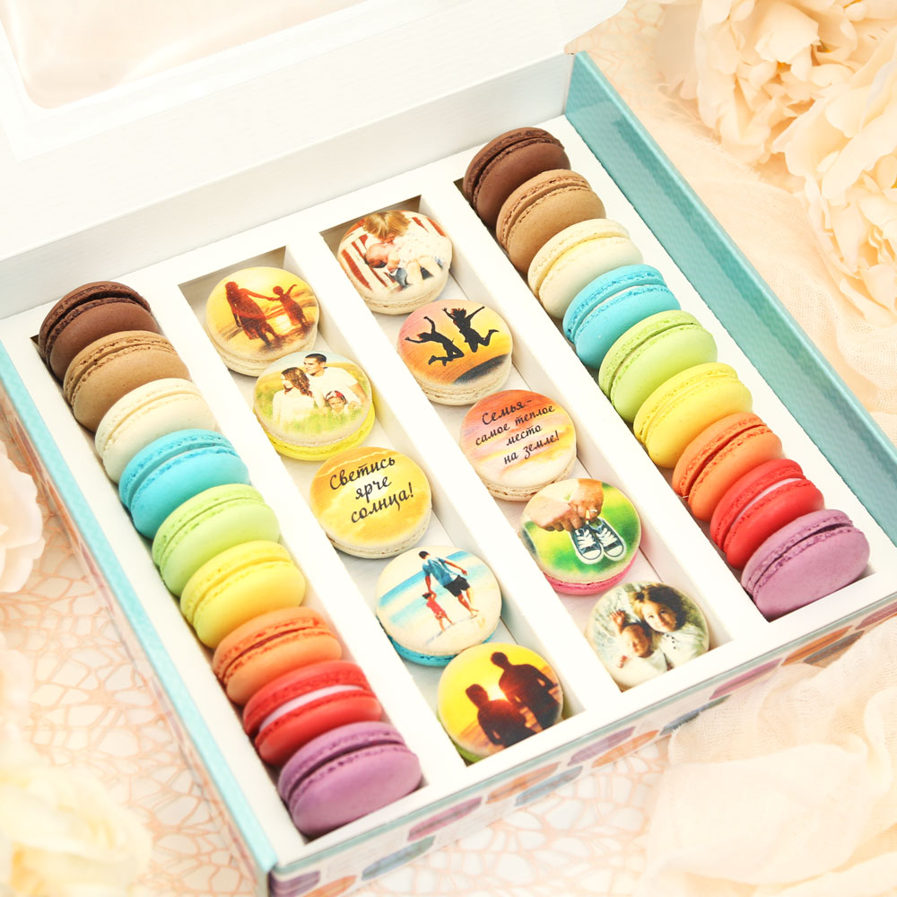 Большой подарочный набор из 28 макарун с фото и надписями, красиво упакован и оформлен. Нижние половинки и начинка ассорти.