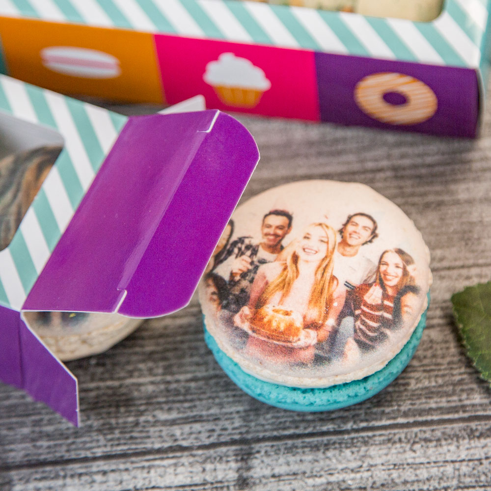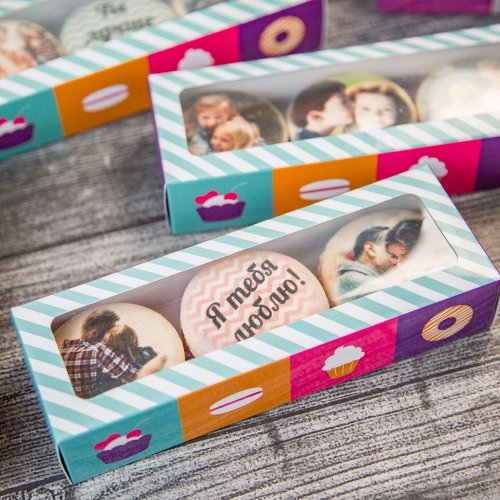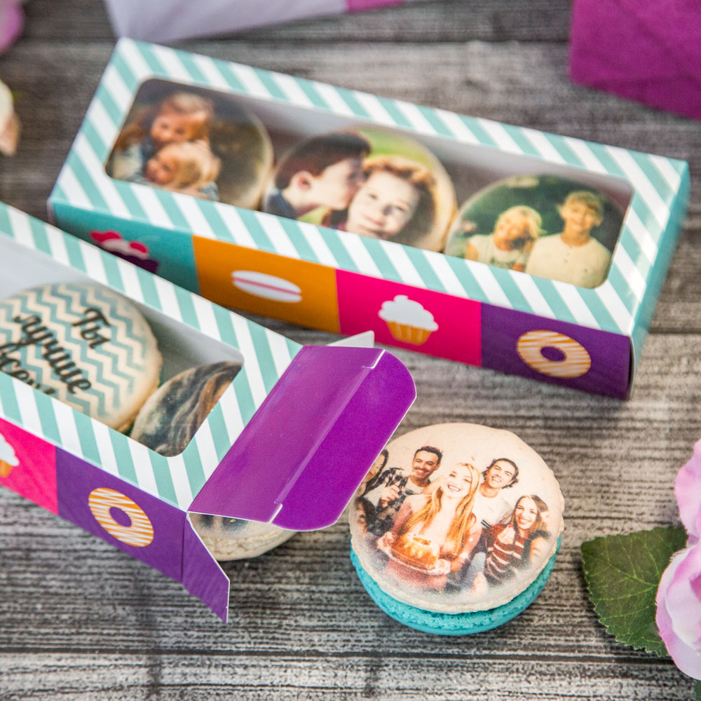 Подарочный набор из 3 пирожных макарун с фотографией и надписями. Минимальный заказ - от 10 одинаковых наборов. Цвет нижних половинок и вкус начинок - ассорти.