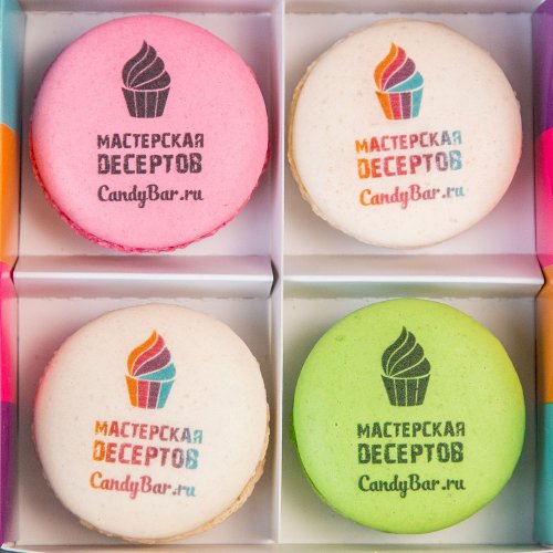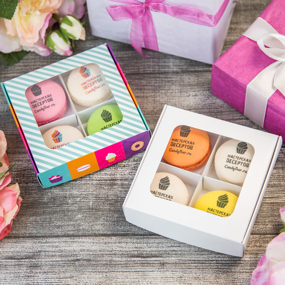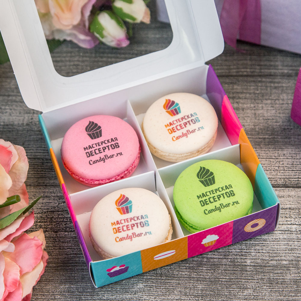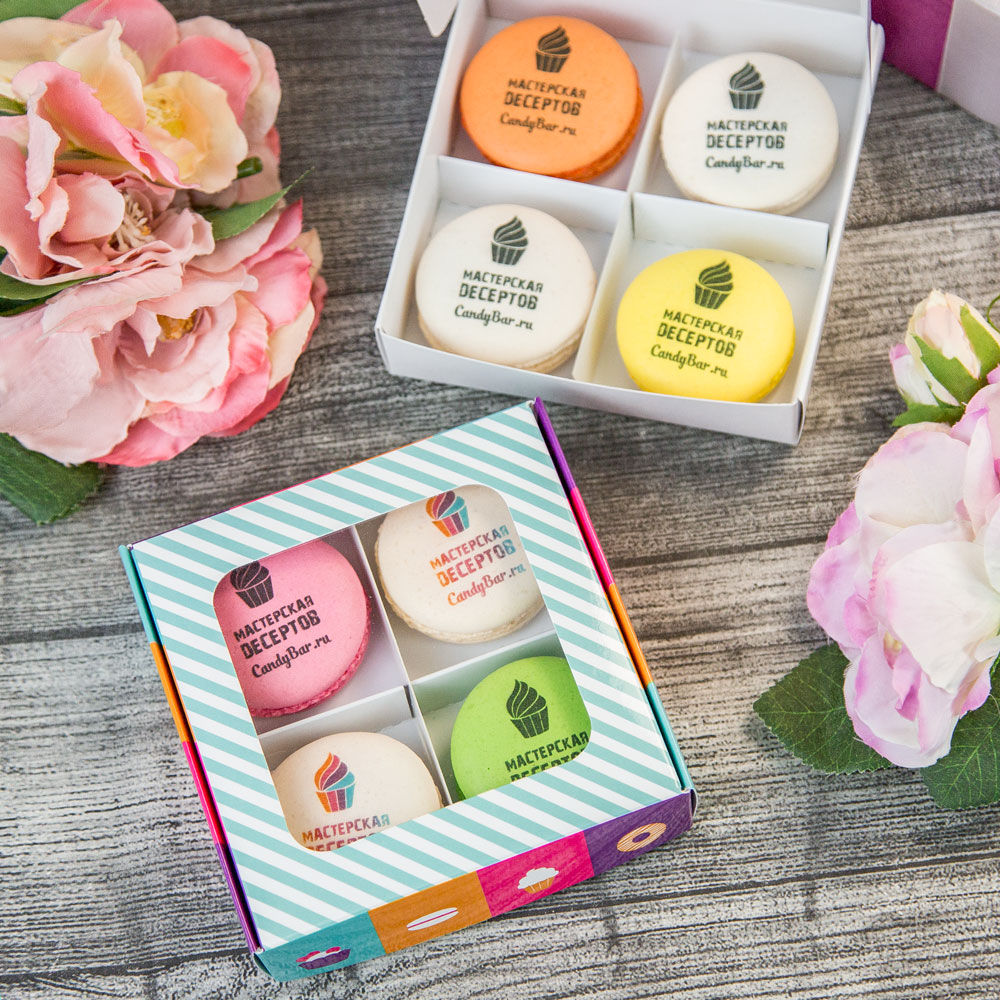 Набор макарун с логотипом 4 шт. - белая или цветная коробка на выбор.<br>