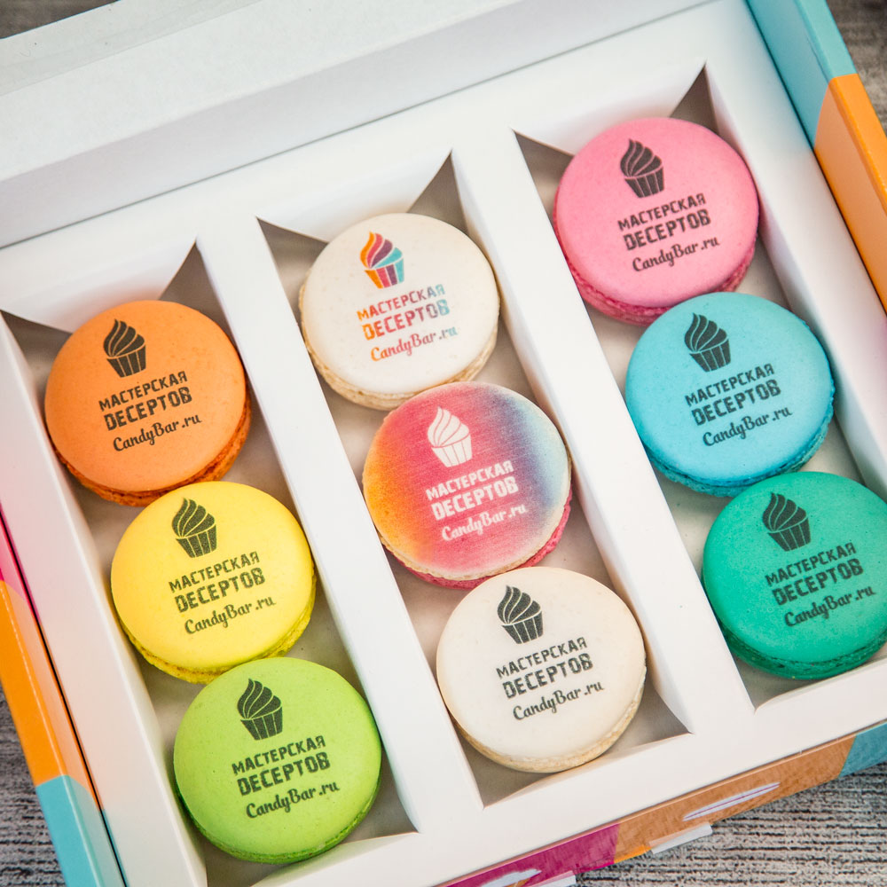 Сладкий корпоративный подарок - набор из 9 миндальных пирожных макаронс с вашим логотипом. Начинки ассорти, цвета - на выбор.<br>