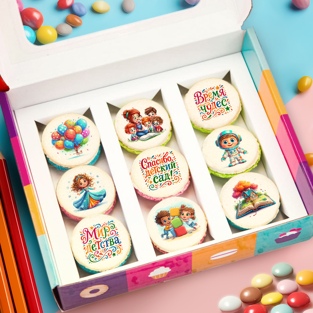- Сахарная пудра, миндальная мука, белок, начинка ассорти (фруктовая/кремовая)
