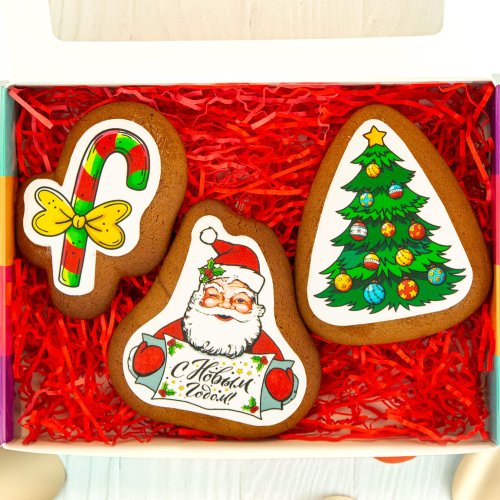 Имбирное печенье - традиционный подарок на Новый год. У нас вы можете купить недорогой набор из 3 пряников, чтобы поздравить ваших близких.