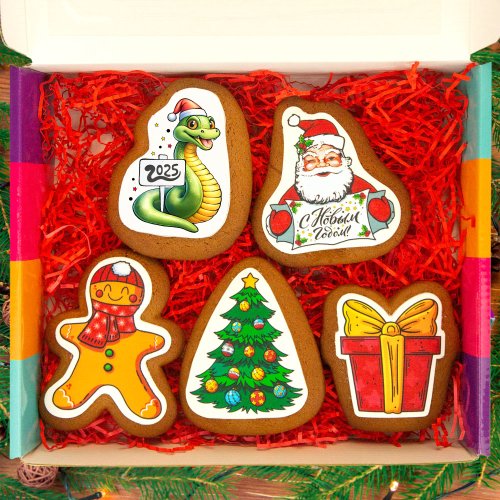 Подарочный набор имбирного печенья - новогодние пряники с яркими съедобными принтами в красивой упаковке. Заказ и доставка в Москве.