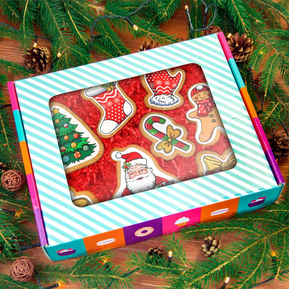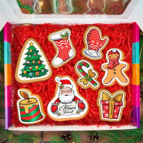 В наборе 8 небольших печений - звездочка, леденец-трость, пряничный человечек, елка, Санта-Клаус, свеча, рождественский сапожок и варежка.