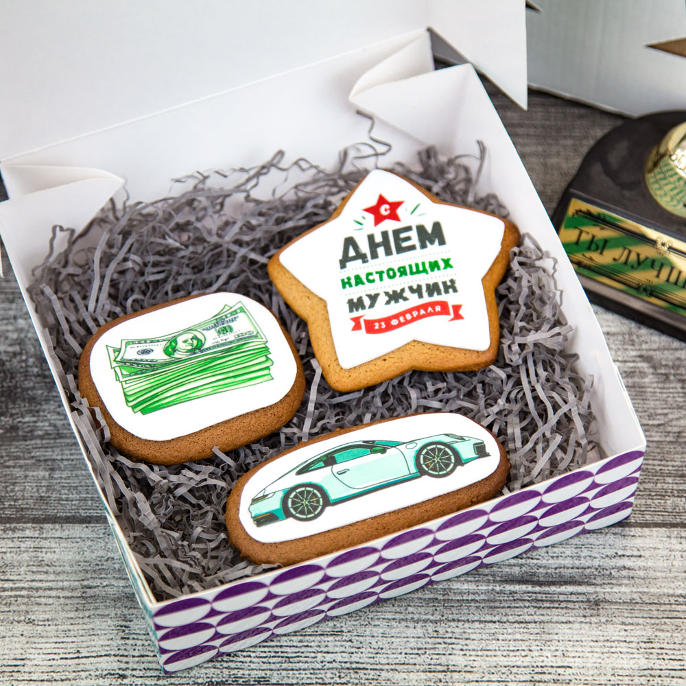 Имбирное печенье - подарок, набирающий большую популярность в последние годы. У нас вы можете купить недорогой набор из 3 пряников на 23 февраля в подарок близким и коллегам. Размер одного пряника - 5-8 см. Размер коробки - 17х17х6 см. *Вы можете заказать печать логотипа на любом печенье или прянике, любую форму печенья и брендирование упаковки