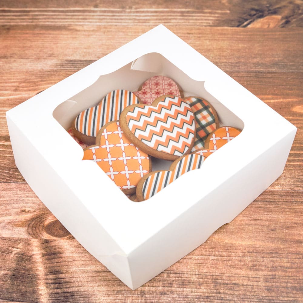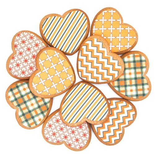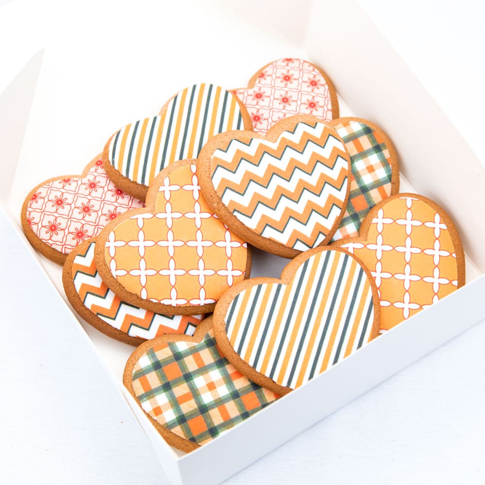Все описаниеНабор печенья в форме сердечек оранжевого цвета в белой коробке с прозрачным окном. В наборе 10 медово-имбирных печений с разными узорами в оранжевом цвете.