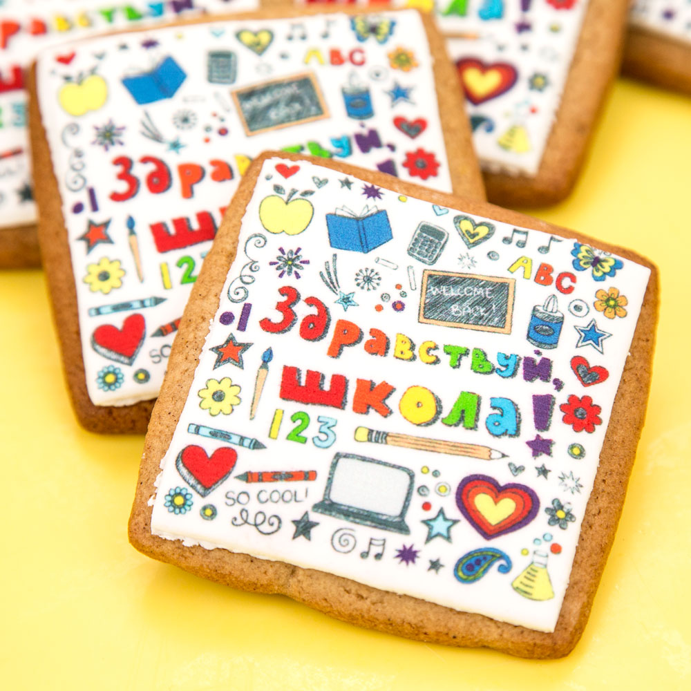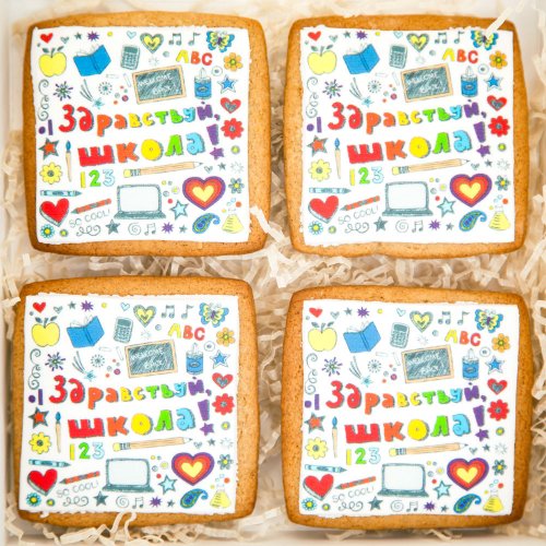 Все описаниеНабор из 4 печений со съедобным принтом - в подарок школьнику на 1 сентября.