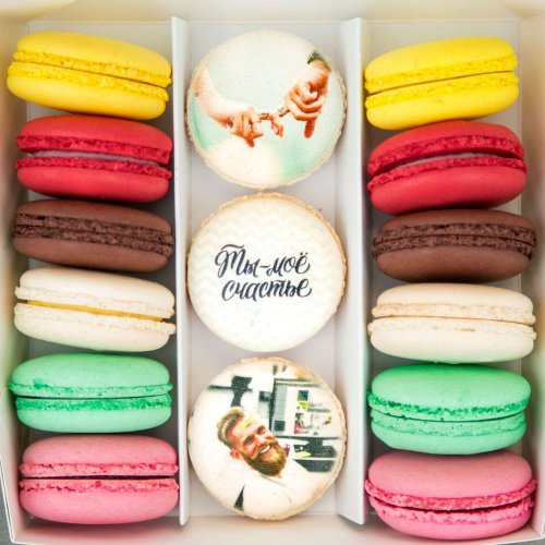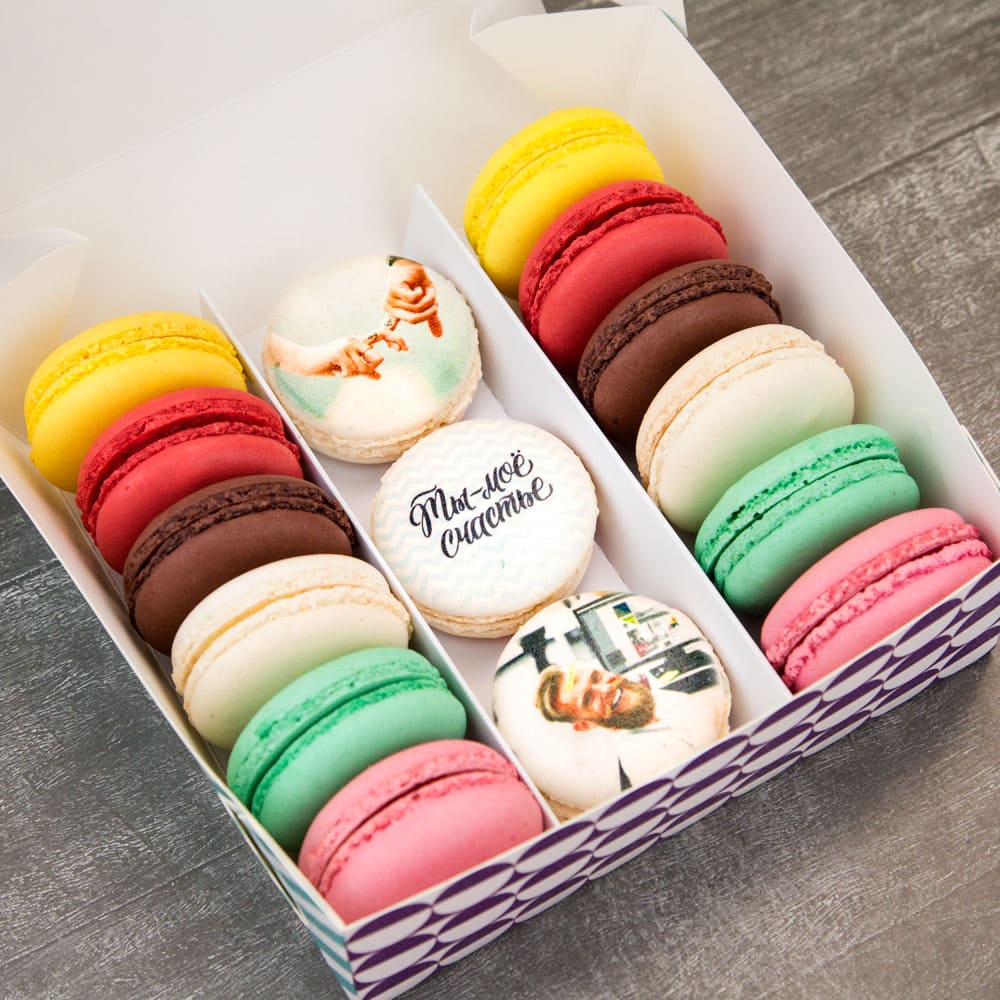 Подарочный набор из 15 пирожных макаруни - 3 штуки с вашими фото или надписями и 12 штук цветных макарунов-ассорти.