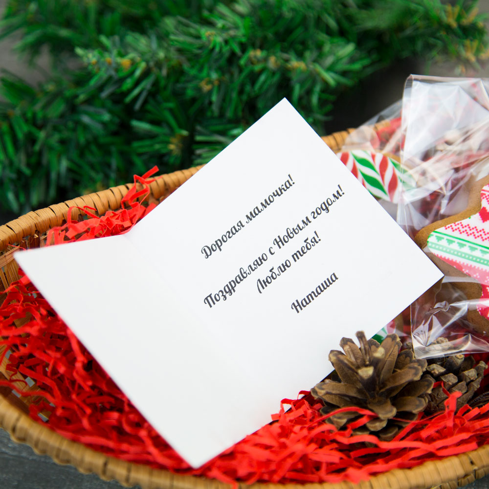Красивая открытка с поздравительным текстом - приятное приложение к подарочному набору десертов.