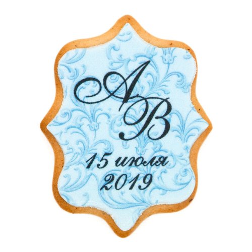 Фигурное печенье-пряник на свадьбу с голубым узором, инициалами молодоженов и датой свадьбы.