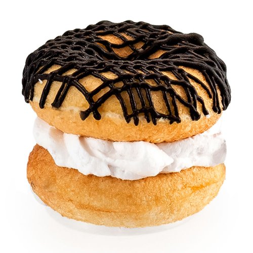 Все описаниеБисквитные пончики с прослойкой из крема (сливочный сыр и сливки) и с узором из черной шоколадной глазури.