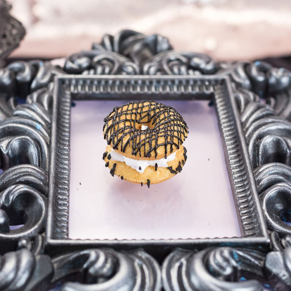 Бисквитные пончики с прослойкой из крема (сливочный сыр и сливки) и с узором из черной шоколадной глазури.