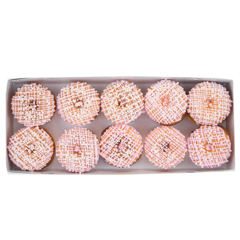 Бисквитные пончики с прослойкой из крема (сливочный сыр и сливки) и с узором из нежно-розовой шоколадной глазури.