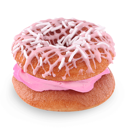 Все описаниеБисквитные пончики с прослойкой из крема (сливочный сыр и сливки) с добавлением малинового пюре. Поверхность украшена поливкой из розовой шоколадной глазури.