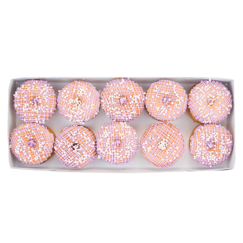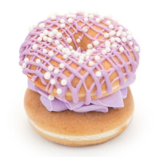 Все описаниеБисквитные пончики с прослойкой из крема (сливочный сыр и сливки) и с узором из сиреневой шоколадной глазури.