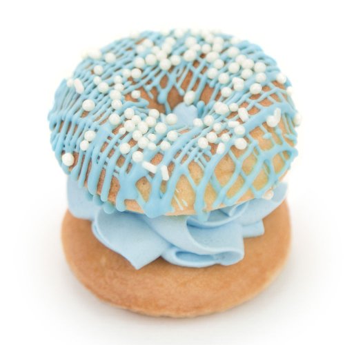 Все описаниеБисквитные пончики с прослойкой из крема (сливочный сыр и сливки) и с узором из светло-голубой шоколадной глазури.