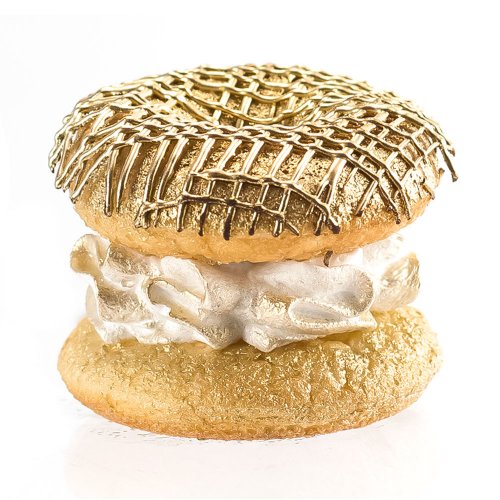 Все описаниеБисквитные пончики с прослойкой из крема (сливочный сыр и сливки) и с узором из золотой шоколадной глазури.