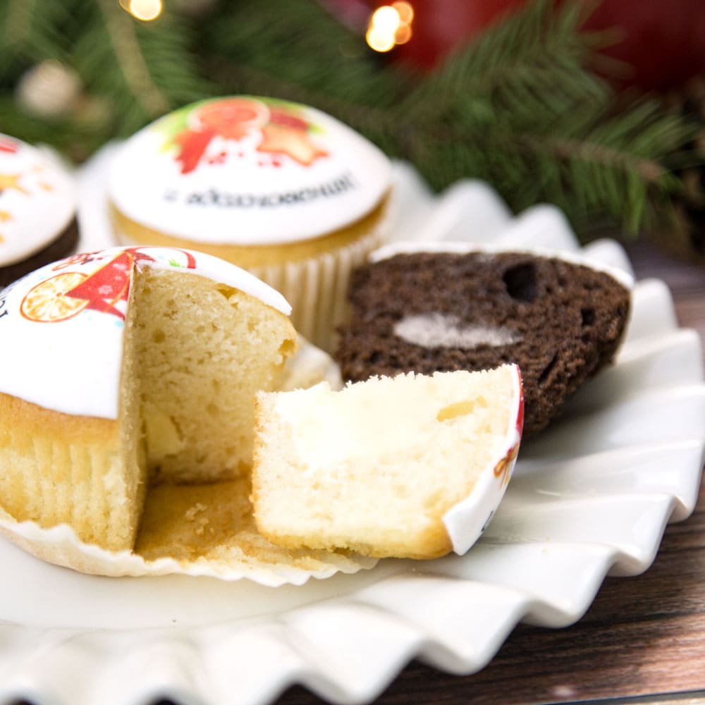 Капкейк из нежного ванильного бисквита с кремовой начинкой внутри. Украшен шапочкой из мастики со съедобным логотипом. Вы можете выбрать белую или цветную упаковку.<br>