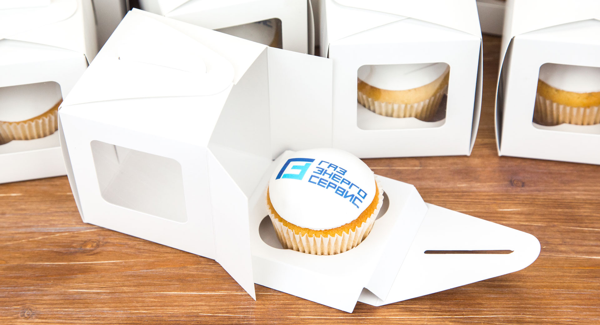 Сладкие подарки клиентам от ГазЭнергоСервис - капкейки с логотипом в коробочке