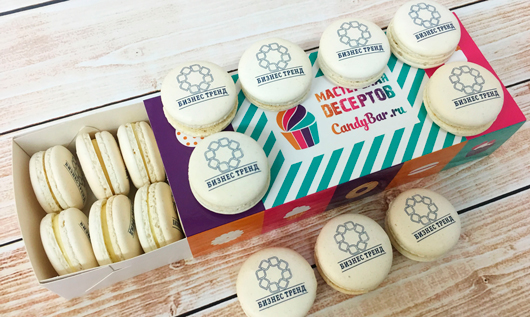 Сладкие подарки клиентам от компании Бизнес тренд - лого на макарунах