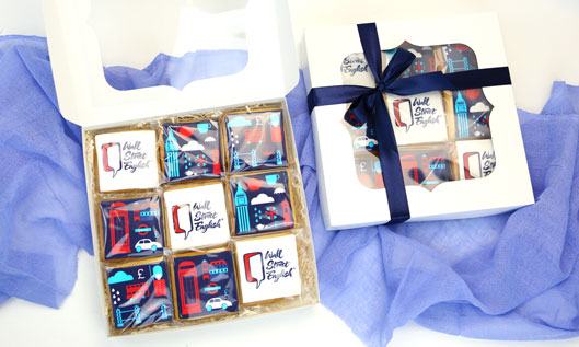 Корпоративные подарочные наборы от компании Wall Street English - печенье с логотипом в коробочке с лентой
