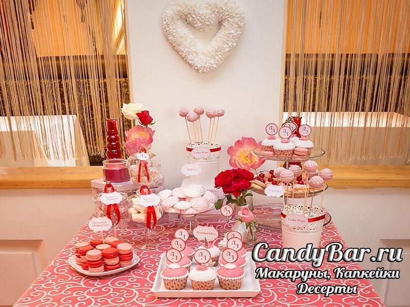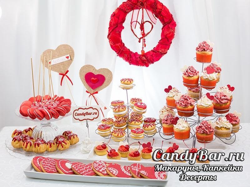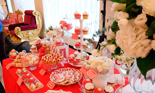 Кэнди бар на свадьбу в белом цвтее с красными оттенками